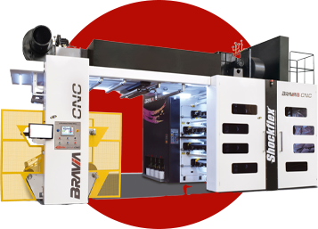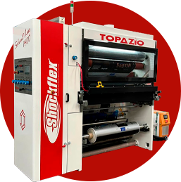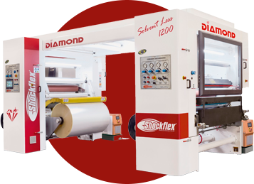 Com sistema de saíde lateral de anilox e camisas de laminação nas duas aplicações de adesivos.